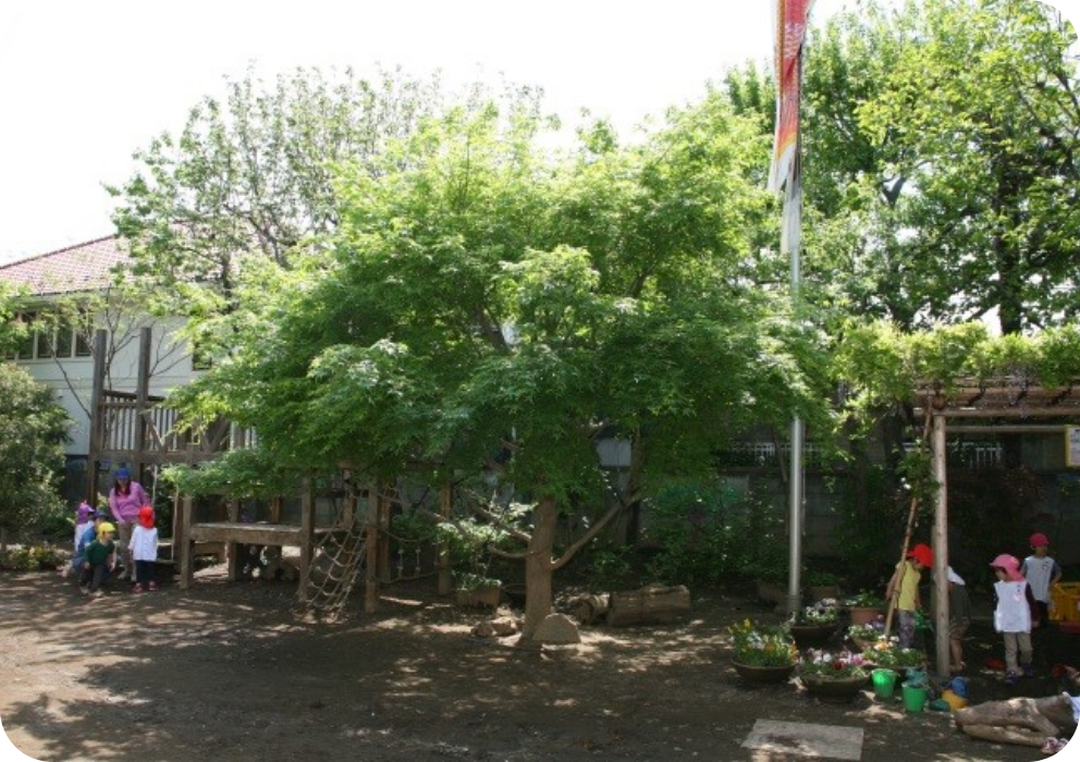 また、園庭も新しくなりました。水・土・光・風・雨・太陽・動植物と響きあい、関わりあってほしいと願いました。新しい環境の下、子どもたちと先生たちとの、よく感じ、よく考え、よく遊ぶ幼児期の豊かな生活が日々繰りひろげられています。